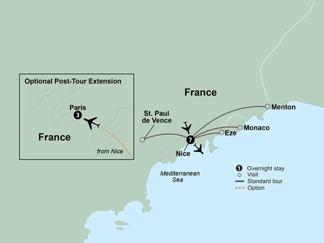 It’s time to live the good life and embark on a getaway to the fabulous French Riviera, or Côte d'Azur. Its elegant coastal resorts, superb eateries, chic boutiques, and captivating museums make it the ultimate sunny retreat for the elite. Unpack your bags just once and stay at a single hotel for your entire adventure, which begins with an overnight flight to France.