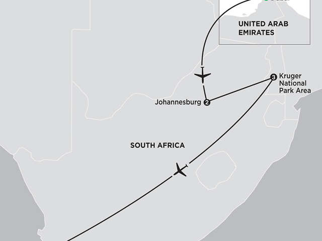 DUBAI Sightseeing with a Local Guide; visit the spice souk, the gold souk, and the Burj Khalifa; Host service during your stay JOHANNESBURG Visit Soweto, Mandela House, and the Apartheid Museum MPUMALANGA Drive along the Panoramic Route and visit God’s Window, Lisbon Falls, and Berlin Falls KRUGER NATIONAL PARK AREA Four game drives in Kruger National Park CAPE TOWN Cable-car ride up Table Mountain; visit a colony of Africa penguins and Cape Point Nature Reserve with funicular ride to old Cape Point lighthouse