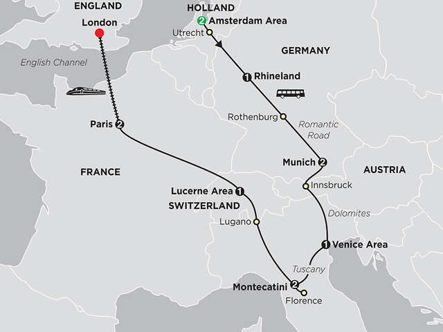 Individual headsetsSightseeing: Visits to Utrecht, Rothenburg, Innsbruck, Venice, Montecatini, Lugano, Lucerne. Inside visits and special features are shown in UPPERCASE in the tour description including admission charges where applicable.