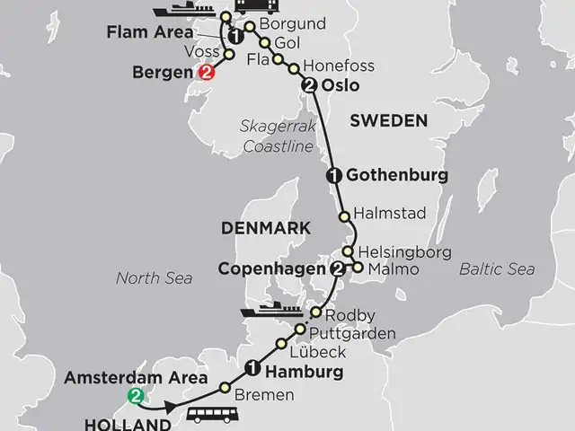 Follow in the footsteps of the Vikings as you explore many of northern Europe’s fascinating cities and scenic areas. This Scandinavia tour starts in Amsterdam with a canal cruise and ends in Bergen with guided sightseeing. Along the way, you’ll overnight in Hamburg, Copenhagen, Gothenburg, Oslo, and the Flam area.One of the Scandinavia tour highlights is a breathtaking ride on the Flam train, one of the world’s most scenic train rides, which passes through 20 tunnels and climbs to an elevation of 2,833 feet. Witness hypnotic waterfalls cascading down the side of steep, snowcapped mountains; rivers winding through deep gorges; farms on the side of steep slopes; and views of Sognefjord, Norway’s longest and deepest fjord. You’ll also take a scenic cruise on the Sognefjord with its majestic mountains, fresh mountain air, and small, idyllic villages dotting the landscape. Witness charming little fishing villages, rocky islands, and granite rocks along the scenic Skagerrak coastline from Gothenburg, Sweden’s second-largest city and one of Europe’s major seaports, to Oslo. Also enjoy the drive through Norway’s Hallingdal Valley with its splendid mountains, lakes, and rivers. Enjoy guided sightseeing in Amsterdam, Hamburg, Copenhagen, Oslo, and Bergen. Other tour highlights include seeing some UNESCO World Heritage Sites. In the German town of Bremen, a Hanseatic city with a history dating back 1,200 years and an important trading town in the 11th century, see the Town Hall, built between 1405 and 1410. Stop in the Hanseatic city of Lübeck, founded in 1143 on the Baltic Coast of northern Germany. In Bergen, see the Bryggen Hanseatic wharf with foundations dating to the 12th century. These are just a few of the many highlights of this value-minded tour to Scandinavia. Be sure to bring your camera to capture the beauty and wonderful memories.