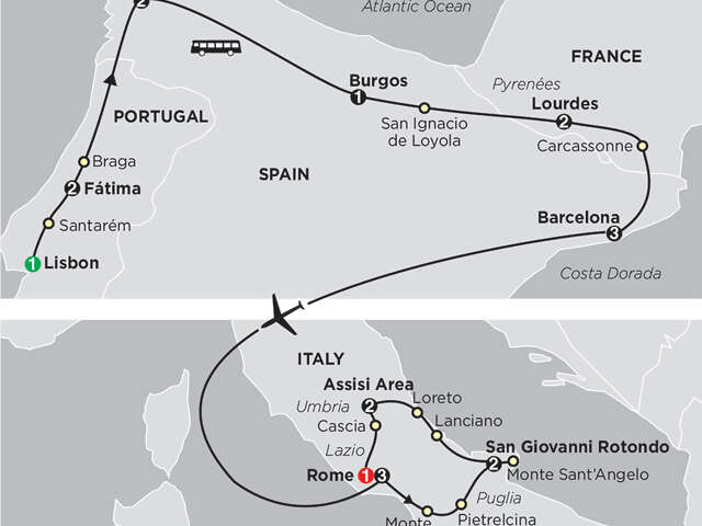 Reaffirm and celebrate your faith on this Portugal, Spain, France, and Italy tour with overnights in Lisbon, Fátima, Santiago de Compostela, Burgos, Lourdes, Barcelona, Rome, San Giovanni Rotondo, and the Assisi area. Along the way, visit some of the world’s most famous shrines, pilgrimage sites, and spiritual places.Santiago de Compostela has been known as a pilgrimage site since the 9th century. Spend two nights here and visit St. James’ Cathedral, where you’ll have the opportunity to attend Mass. You’ll also attend Mass in Fátima, home to one of the most famous Catholic shrines; in Rome at St. Mary Major Basilica, the most important Roman church dedicated to the Virgin Mary; in San Giovanni Rotondo’s Old Church; in Assisi’s St. Francis Basilica; in St. Francis’ church in Lanciano; and in the 17th-century Sanctuary of Loyola, built to honor the founder of the Jesuits. Join pilgrims for the Rosary and candlelight processions in Fátima and in Lourdes, another of the world’s most famous pilgrimage places, where you’ll also enjoy a guided walking tour. Other highlights of this faith-based tour are visits to Monte Sant’Angelo, one of Christendom’s most celebrated shrines, and Jeronimos Monastery, dating to the mid-1400s. In Carcassonne, visit the medieval fortified citadel and marvel at the ramparts, castle walls, and drawbridges. In Burgos, visit the cathedral where El Cid is buried. In Barcelona, visit the Sagrada Familia, Gaudi’s masterpiece. In Braga, one of the world’s oldest Christian cities, visit Bom Jesus do Monte Sanctuary, where devout followers have walked the “Stations of the Cross” since 1811. In Rome, attend the Papal audience (subject to availability) and visit the world-famous Colosseum. All of this and much more are included on this inspirational Portugal, Spain, France, and Italy tour designed for value-minded travelers.