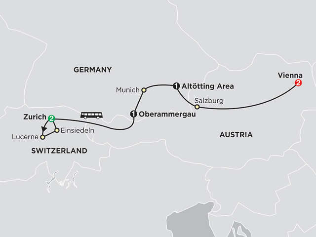 Reaffirm your faith on this tour through Alpine Europe. Along the way, visit some of Alpine Europe’s most important spiritual sites and pilgrimage destinations and collect your thoughts in contemplation of the exceptional natural beauty of the mountainous areas you will be travelling through.The tour highlight is definitely the Passion Play in Oberammergau. Performed by Oberammergau residents every 10 years as a thank you for the village being saved from the Black Death, this reenactment is a once-in-a-lifetime experience. Another interesting visit is Melk’s 11th-century Benedictine Abbey. Words cannot describe the splendor of the abbey with its ornate library, frescoed ceilings, stunning high altar, marble statues, and 210-foot-high cupola. You’ll also visit some of Alpine Europe’s most important pilgrimage sites. Since the Middle Ages, the Benedictine Abbey of Einsiedeln has been one of Switzerland’s most important pilgrimage sites dedicated to the Virgin Mary. Here, visit the magnificent 18th-century baroque monastery and the chapel that is home to the Black Madonna, carved in the 15th century. Altötting has been the spiritual focal point of Bavaria for more than 1,250 years and Germany’s main Marian pilgrimage site. Here, enjoy a guided visit of the Old Town and see the large-scale panorama created in 1902 portraying Jerusalem and the Crucifixion of Christ. You can even join the evening Mass and candlelight procession. You’ll also have the opportunity to celebrate Mass at Vienna’s magnificent St. Stephen’s Cathedral.All of this and more—including time in the picturesque towns of Lucerne and Salzburg and the vibrant city of Munich—are included on this faith-based tour designed for savvy, value-minded travelers. Accompanied by fellow believers, it’s an Alpine Europe vacation you will cherish in your memories for a long time.