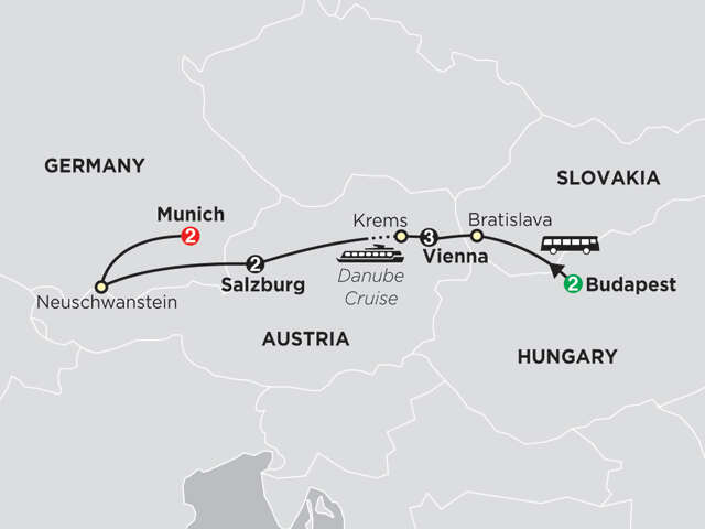 Join us for a royal adventure through the historic sites of Hungary, Slovakia, Austria, and Germany! This affordable tour of Europe takes you to some of the continent’s most legendary sites, including a Danube River cruise through Austria’s stunning Wachau Valley. Begin in Budapest—called the “Pearl of the Danube.” Explore the Hungarian capital with its treasure trove of architectural wonders with a guided city tour. You’ll travel through Slovakia, stopping in Old Town Bratislava, on your way to Austria. You’ll spend two glorious days in Vienna, the “City of Music”—with guided sightseeing of its enchanting city center with its iconic sites. You’ll board your boat in Krems for a river cruise along the Danube’s Wachau Valley to Salzburg. Enjoy an orientation in Salzburg, the exquisite city of Mozart’s birth. You’ll experience more stunning sights on your way to Munich, with a visit to the storybook site of King Ludwig’s Neuschwanstein Castle. You’ll tour the lavish halls inside this inspiration of Disney’s Magic Kingdom, with stories of the King’s descent into madness. Your European vacation ends with two fascinating days in Munich. Tour the Marienplatz (Main Square) catch a Glockenspiel performance on the new Town Hall, or relax in a traditional biergarten for a stein or two of classic German beer. Your value-minded tour of Hungary, Vienna, and Germany through some of Europe’s favorite destinations is a royal experience not to be missed!