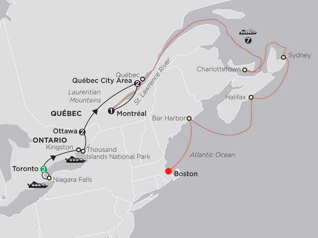 Exciting cities and breathtaking scenery await you on this eastern Canada tour. You’ll spend two nights in Toronto, Ottawa, and the Québec City area, and one night in Montréal. You’ll also enjoy a 7-night cruise traveling the coastlines of eastern Canada and New England. On your sightseeing tour in each city, you’ll see the must-see sights, such as the 1,815-foot-tall CN Tower in Toronto, Canada’s largest city; the Canadian Mint in Ottawa, Canada’s capital; Québec City’s Place Royale, the historic square known as the birthplace of French America; and Montréal’s Mount Royal, designed by the same designer as New York City’s Central Park. In Ottawa, you’ll visit the Royal Canadian Mounted Police stables, a tribute to Canadian heritage and history. In Québec, visit the Basilica of Notre Dame, dating to the 19th century, and Cap de la Madeleine, a national shrine with its fine stained-glass windows. Also enjoy time to explore Québec City, Canada’s only walled city and a UNESCO World Heritage Site.But that’s not all…you’ll enjoy stunning scenery on this eastern Canada tour. For a tour highlight, board a sightseeing boat for a thrilling ride to view breathtaking Niagara Falls. You’ve seen photos of Niagara Falls, and now’s your chance to see it up close. Also enjoy a cruise that takes a scenic route through the many islands of St. Lawrence Islands National Park. More picturesque scenery awaits you on your 7-night cruise to some of Canada’s historic towns and beautiful places. Ports of call include Québec City; charming Charlottetown on Prince Edward Island; Sydney, originally settled by Highland Scots; Halifax; Bar Harbor, surrounded by Acadia National Park; and Boston. From the vibrant cities to the beautiful scenery, this eastern Canada tour—with a 7-night cruise—designed for the value-minded traveler is a wonderful vacation!