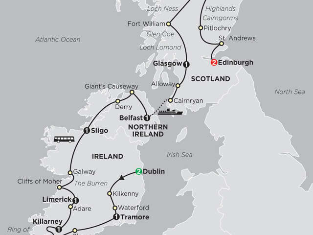 DUBLIN Orientation drive KILKENNY Visit the colorful town WATERFORD Visit the home of the famous crystal BLARNEY Visit the famous village RING OF KERRY Takes pictures of the Lakes of Killarney KILLARNEY Visit the popular resort town ADARE Admire the thatched cottages CLIFFS OF MOHER Savor the spectacular views GALWAY Visit the port city DERRY Visit the walled city GIANT’S CAUSEWAY See the amazing basalt columns BELFAST Visit Northern Ireland’s capital BELFAST-CAIRNRYAN by ferry ALLOWAY Stop in Robert Burns’ birthplace FORT WILLIAM INVERNESS Visit the Highland capital CULLODEN MOOR See the battle site PITLOCHRY Visit the Highland resort ST. ANDREWS Visit the home of golf EDINBURGH Guided sightseeing, visit Edinburgh Castle