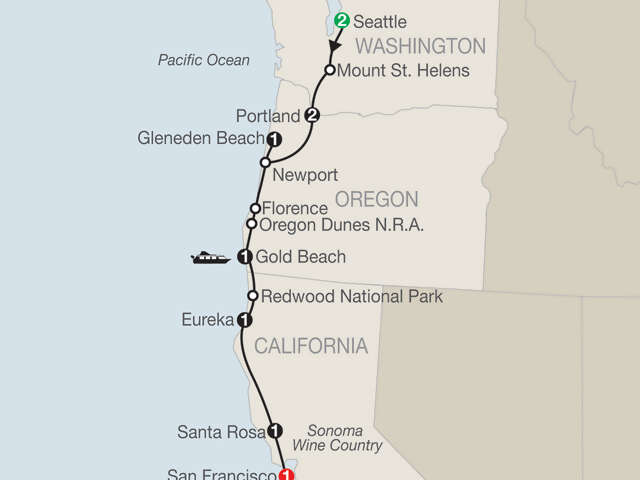 A sampling of Seattle, the beautiful Oregon coast, and the California wine country make this magnificent journey along the Pacific Coast one you’ll remember. Start your vacation in charming Seattle; then travel south to Portland for a sightseeing tour and a visit to the International Rose Test Gardens, the largest rose garden in Portland. Portland is known for its foodie culture, and you’ll get a chance to discover it on your Portland tasting tour and excursion to a local winery. Enjoy some of the spectacular scenery waiting in Oregon, including Oregon Dunes National Recreation Area, with wind-sculpted sand dunes stretching 500 feet above sea level; the scenic Rogue River, where you’ll experience a thrilling ride through this wild and remote region via glass-enclosed jetboat; and the many majestic views and scenic lighthouses along the Oregon Coast.In California, view the world’s tallest trees in spectacular Redwood National Park and along Avenue of the Giants, a quiet 2-lane road that winds through some of the world’s most spectacular scenery with ancient redwood trees. You’ll even have the opportunity to see an 1,800-year-old redwood! In the famous wine-making region of Sonoma, visit Gloria Ferrer Caves & Vineyard to tour the wine caves and taste the wines. Conclude your Pacific Coast vacation in vibrant San Francisco.