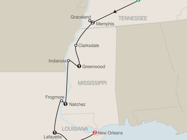 NASHVILLE Sightseeing including a visit to Honky Tonk Row; visit the Country Music Hall of Fame; reserved seats at the Grand Ole Opry; [LF] visit and make a recording at RCA Studio BMEMPHIS Visit Sun Studios and Stax Museum of American Soul Music; sightseeing tour with Local Guide; visit to GracelandCLARKSDALE Visit to Delta Blues Museum, [LF] lunch at Morgan Freeman’s Ground Zero Blues ClubGREENWOOD OrientationINDIANOLA Visit to the B.B. King MuseumNATCHEZ Enjoy a carriage ride with dinner at an antebellum mansionFROGMORE Visit a cotton plantation; Louisiana Delta Music MuseumLAFAYETTE [LF] Special program at Martin Accordions; cruise on the Atchafalaya BasinGREAT RIVER ROAD Guided visit of Oak Alley PlantationNEW ORLEANS Sightseeing, New Orleans Jazz National Historic Park, National WWII Museum, farewell dinner