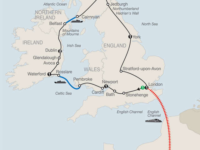 STONEHENGE Visit the prehistoric monumentBATH Visit the Roman relicsNEWPORT Welcome dinnerCARDIFF Orientation drive, guided tour of Cardiff CastlePEMBROKE–ROSSLARE Cross St. George’s Channel by ferryWATERFORD [LF] Enjoy a traditional Irish coffee; guided tour of the House of Waterford CrystalAVOCA [LF] Guided tour of the handweaving millGLENDALOUGH Guided tour of St. Kevin’s center of Irish ChristianityDUBLIN Orientation drive, visit Trinity CollegeBELFASTOrientationBELFAST–CAIRNRYAN Cross the North Channel by ferryEDINBURGH Guided sightseeing, visit Edinburgh CastleJEDBURGH Take pictures of the abbey ruinsYORK Walking tourSTRATFORD-UPON-AVON Take pictures of Anne Hathaway’s Cottage, visit Shakespeare’s birthplace and [LF] enjoy lunchLONDON-PARIS By high-speed Eurostar TrainPARISGuided sightseeing, visit the Notre Dame Cathedral and The Louvre