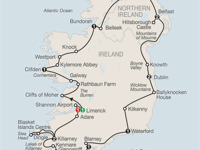 LIMERICK Welcome dinnerCLIFFS OF MOHER Savor the spectacular viewsRATHBAUN FARM See the farmer at work and enjoy morning coffee in the farmhouseGALWAY OrientationCONNEMARA Visit a marble workshopKYLEMORE Visit the Benedictine abbeyWESTPORT Visit this heritage townKNOCK Visit the religious siteBELLEEK Guided tour of the pottery factoryDERRY Guided walking tourCOUNTY ANTRIM Take pictures of Dunluce Castle, visit Giant’s CausewayBELFAST Guided “Living History” tour, visit the Titanic Exhibition, guided tour of Hillsborough Castle and enjoy [LF] Afternoon Tea in one of the State RoomsBOYNE VALLEY Guided tour of the Bronze Age passage-grave at KnowthDUBLIN Orientation driveBALLYKNOCKEN HOUSE [LF] Baking demonstration and morning coffee and sconesKILKENNY Explore this pretty county townWATERFORD [LF] Enjoy an Irish Coffee demonstration; guided tour of the House of Waterford Crystal; guided walking tourBLARNEY Visit the famous castle and kiss the Blarney StoneGLENGARRIFF Private boat to Garinish IslandRING OF KERRY Take pictures of the Lakes of KillarneyDINGLE PENINSULA Visit the Blasket Islands Centre and the town of DingleADARE Admire the thatched cottages