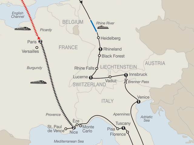 AMSTERDAM Welcome dinner; guided sightseeing and a canal cruise; visit a major diamond centerRHINE CRUISEHEIDELBERG Take pictures of the castleBLACK FOREST Hear about the art of woodcarvingRHINE FALLSLUCERNE Walking tour including the Lion Monument and the Chapel BridgeVADUZ Visit the capital of LiechtensteinINNSBRUCK Walk through the Old Town to the Golden RoofVENICE Private boat ride; visit St. Mark’s Square; glassblower demonstration; [LF] special dinner with wine at a local restaurantROME Guided sightseeing, visit the Vatican Museums and Sistine Chapel, St. Peter’s Square and Basilica, the Colosseum and Roman ForumFLORENCE Guided walking tour, visit Signoria Square; [LF] light lunch with various local winesPISAMarvel at the legendary Leaning TowerÈZEVisit a perfume factoryNICEExcursion to [LF] St. Paul de Vence and enjoy a glass of PastisNICE–PARIS By high-speed TGV train (first-class)PARISGuided sightseeing, ascend the Eiffel Tower; dinner with wine at a local restaurantPARIS-LONDONHigh-speed Eurotrain; guided sightseeingLONDON Guided sightseeing, visit St. Paul’s Cathedral and see the Changing of the Guard, if heldHeadsets throughout the tour