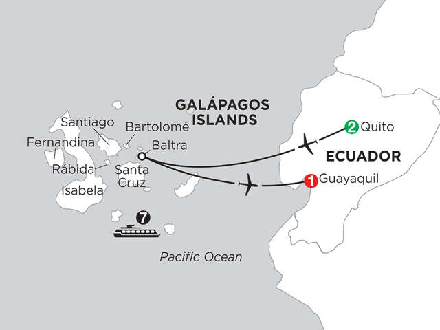 Iguanas, and sea lions, and turtles, oh my! Where on earth can you find more rare species of plants and animals than people? The Galápagos Islands, of course! And when you cruise to this unique group of islands with Monograms, there is no stress, just fun! We take care of the hassles for you, from your hotel and cruise accommodations, to sightseeing and most meals. We even set you up with a Local Host® to help meet your needs during your stay, so that all you have to do is remember to pack your swimsuit!Your vacation begins in Quito, where your Local Host will greet you and help acquaint you with the city. The next morning, after an included breakfast, you will head out on a private tour to explore the city, rich with history and marked by the legacy that the Incas and Spaniards left behind. See Independence Square, the cathedral, and San Francisco Plaza Church. Enjoy an afternoon of leisure before packing your bags and heading off to the Galápagos the next morning. You will embark on a 7-night cruise around the gorgeous and one-of-a-kind Galápagos Islands. For this leg of your adventure, all of your meals are included. Begin your adventure at the Charles Darwin Research Station to see and learn about the Giant Tortoises native to these islands. You’ll also visit Bartolomé, where you can see a fascinating moonscape and take a hike to see the striking view of the surrounding islands; Rábida Island, where you will discover a rare red sand beach, home to colonies of marine iguanas, sea lions and several species of Darwin’s finches; Santa Cruz, where the clear, calm waters of Black Turtle cove offer the perfect place to see a colorful array of fish, rays and reef sharks; Isabela and Fernandia Islands where you can watch for flightless cormorants, penguins, and whales, and finally, Santiago Island, where you can explore tidal pools populated by fur seals and Sally Lightfoot Crabs. Throughout your cruise there will be multiple opportunities to snorkel in search of the diverse and colorful marine life found in the archipelago. So grab your camera and say “Sayonara” to the stresses of planning your own vacation. With Monograms, your vacation package to the Galápagos Islands is as stress free and fabulous as you dreamed it would be!