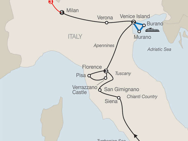 ROME [LF] Welcome dinner with wine at the rooftop restaurant of your hotel overlooking Rome; guided sightseeing, visit the Vatican Museums and Sistine Chapel, St. Peter’s Square and Basilica, [LF] admire Michelangelo’s Moses in St. Peter in Chains; visit the Colosseum and Roman ForumSIENA Walking tour including Piazza del CampoSAN GIMIGNANO OrientationFLORENCE Guided walking tour, visit Michelangelo’s David and Signoria Square, and Santa Croce BasilicaPISA Marvel at the legendary Leaning TowerVERRAZZANO CASTLE [LF] Wine tasting and lunchVENICE Private boat ride; guided walking tour, visit St. Mark’s Square and Basilica, Doges’ Palace and the Bridge of SighsMURANO & BURANO [LF] Lagoon cruise and island visits, including a glassblower demonstration in Murano and lunch in BuranoVERONA Walking tour including Juliet’s balcony and the ArenaMILAN Walking tour, visit the museum of La Scala opera house and the Galleria; farewell dinner with wine at a local restaurant LAKE MAGGIORE Guided sightseeing and boat ride to Isola Bella to visit the baroque palace and peacock gardensHeadsets throughout the tour