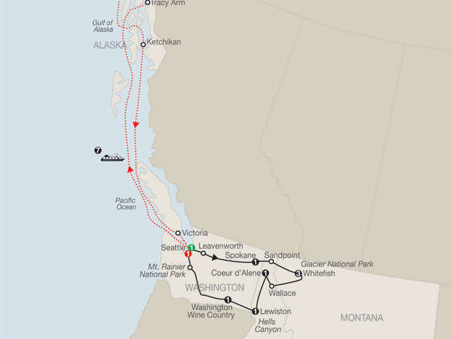 This unique vacation visits some of the most beautiful areas in the U.S., along with the majesty of an Alaskan cruise through the famed Inside Passage. From the most northwesterly point of Seattle, trek deeper into the lush and awe-inspiring Pacific Northwest. A highlight of this vacation will undoubtedly be your stay at Spokane’s historic Davenport Hotel, an architectural masterpiece combining luxury, impressive décor with hand-painted frescos, and contemporary comfort. From here, head to Whitefish and Glacier National Park, Montana, for several days of unbelievable landscapes and a plethora of fun-filled activities, like a BBQ, a cruise around Lake McDonald, and a vintage Red Jammer bus tour to the top of Logan Pass. Also stop in Wallace, where the story of a former brothel reveals some of the town’s colorful history. In Coeur d’Alene, Idaho, a pristine lake greets you, then head to Hells Canyon and the Snake River, the deepest river gorge in North America. Travel the same route as Lewis and Clark along the Snake River into Washington’s wine country, the second-largest producer of U.S. wines. Here you’ll meet some of the locals, learn about their land, and visit a winery for a tour and tasting! Return to Seattle, the perfect jumping-off point for your cruise to the vast territory of Alaska! Marvel at glaciers and witness the amazing spectacle of thunder and spray as tremendous slabs of ice break off and “calve” into the sea. Visit Alaska’s capital, Juneau; charming Sitka; and the totems and native culture of Ketchikan. The impressive landscapes of Hells Canyon, Glacier National Park, and Washington State and incredible cruise through Alaska’s Inside passage make this vacation one of a kind!