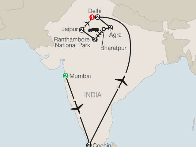 MUMBAISightseeing with a Local Guide; visit the Gateway of India, a Dhobi Ghat, Hanging Gardens, Mumbai Museum, and Mani Bhavan; Host service during your stay; Cochin Sightseeing with a Local Guide; visit the Hill Palace Museum, Dutch Palace, Chinese Fishing Nets, and St. Francis Church; walking tour of Jewish quarter; cruise the backwaters of Kerala; Host service during your stay DELHIVisit Qutub Minar, Humayan’s Tomb, and Gurudwara Bangla Sahib; [LF] rickshaw ride through Chandni Chowk bazaar; welcome dinner with Indian cooking demonstrationAGRA Visit the Taj Mahal at sunrise by [LF] tonga, and Agra FortBHARATPUR–RANTHAMBORE NATIONAL PARKTravel by trainRANTHAMBORE NATIONAL PARK Three game drives by open-air, 4-wheel drive safari vehicleJAIPUR[LF] Home-hosted dinner with Indian noble family featuring a sari- and turban-tying demonstration; visit Amber Fort, Hawa Mahali, and the City Palace & Museum
