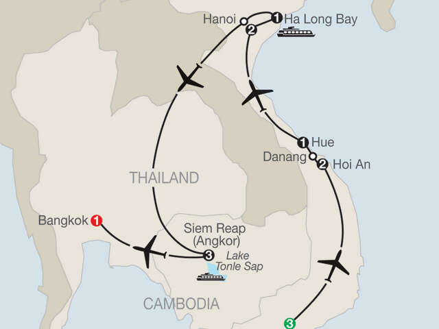 HO CHI MINH CITY Duxton Hotel (SF)HOI AN Palm Garden Resort (SF)HUE Saigon Morin Hotel (F)HANOI Melia Hotel (F)HA LONG BAY Novotel Ha Long Bay (F)SIEM REAP Tara Angkor Hotel (SF)BANGKOK Majestic Grande
