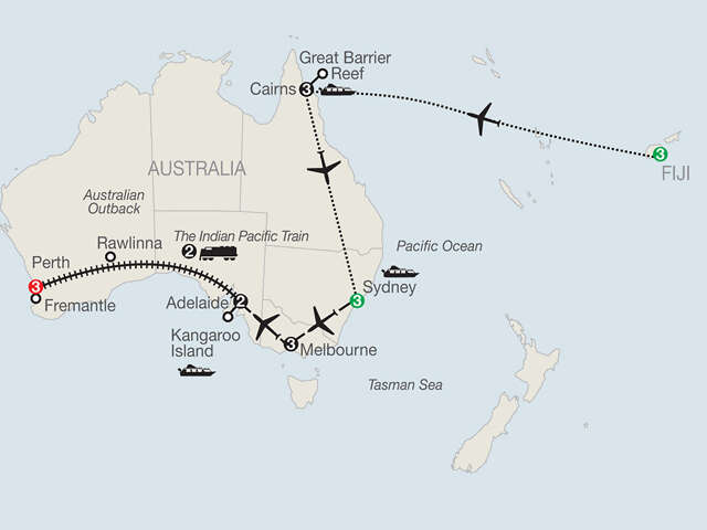 From Sydney, Australia’s largest and most famous city, to Perth, Western Australia’s capital city, this tour through Australia—stopping first in Fiji and the Great Barrier Reef (Cairns)—is a once-in-a-lifetime vacation. You’ll spend three nights each in Nadi, Cairns, Sydney, Melbourne, and Perth; two nights in Adelaide; and two nights aboard the historic Indian Pacific train traveling across Australia.