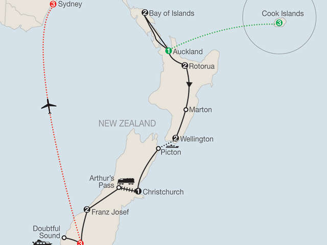 FIJISightseeing tour; visit Viseisei Village and the Garden of the Sleeping Giants; stop at Vuda Lookout; Host serviceAUCKLAND SightseeingBAY OF ISLANDS Visit the Waitangi Treaty House; scenic cruiseROTORUA [LF] Traditional Hangi dinner and Maori cultural performance; visit Rainbow Springs and Te Puia; dinner at a [LF] local family’s homeMARTON Visit a [LF] local farm and enjoy a barbecue lunchWELLINGTON Sightseeing including cable car ride; visit the botanic gardens and Te PapaINTERISLANDER FERRY Scenic cruising across Cook StraitCHRISTCHURCH OrientationTRANZALPINE TRAIN Scenic train journeyFRANZ JOSEF Glacier Valley walkQUEENSTOWN [LF] Winery visit and tasting; visit Fiordland National Park; cruise on Milford Sound; farewell dinnerSYDNEYCity sightseeing; Host service