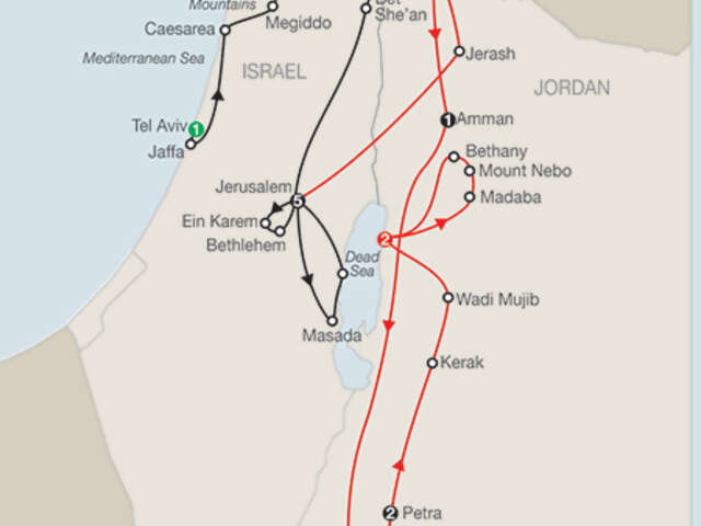 A wonderful vacation! Start in Tel Aviv, then travel via the ancient port of Jaffa and Caesarea—with visits to the Roman Amphitheater and the impressive Crusader Fortress, the fortified city of Megiddo, and Muhraqa—to Tiberias at the Sea of Galilee, where you will stay for two nights. Enjoy an included excursion to Cana, where Jesus changed water into wine, and Nazareth, where you visit the Church of the Annunciation and St. Joseph’s Church. On your way to Jerusalem, enjoy a cruise on the Sea of Galilee, then visit the Mount of Beatitudes; Tabgha; Capernaum, where Jesus recruited his first followers among the fishermen; and Bet She’an with its Roman and Byzantine relics. During your five-night stay in Jerusalem, excursions are included to Ein Karem and Bethlehem, to Masada and the Dead Sea, and a guided walking tour through the Old City. Visit the Mount of Olives, the Garden of Gethsemane, the Via Dolorosa, the Wailing Wall, and more. A full day at leisure allows time for an optional excursion to the Israel Museum with the Shrine of the Book and the Dead Sea Scrolls, and a visit to the Holocaust Memorial at Yad Vashem.Travel via the Allenby Bridge, Jerash, the best-preserved Greco-Roman city in the Middle East, and Um Quais to Amman, Jordan. On your way to the “rose-red city” of Petra, stop in Wadi Rum and experience a spectacular four-wheel drive through the sand dunes. A full day of guided sightseeing includes a walk down the Siq, the narrow gorge made famous in the movie Indiana Jones and the Last Crusade. Admire the Treasury and sip tea in a Bedouin tent. Next, travel to the Dead Sea via Kerak and Wadi Mujib. Two nights here allow time for an included excursion to Madaba, Mount Nebo, where Moses saw the Promised Land, and Bethany Beyond the Jordan.