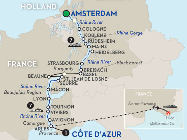 Cruise: deluxe 14-night cruise in an outside stateroom with Avalon’s exclusive Comfort Collection BedsSMDay 1-2 Amsterdam (Embarkation): welcome reception; canal cruise on Day 2Day 3 Cologne: choice of guided city walk or Jewish Heritage walkDay 4 Koblenz–Rhine Gorge–Rüdesheim: guided sightseeing in Koblenz; cruise through the Rhine Gorge; visit Siegfried’s Mechanical Musical Instrument Museum in Rüdesheim; special treatDay 5 Mainz. Excursion to Heidelberg: guided walk, visit the Gutenberg Museum in Mainz; excursion to Heidelberg, guided visit of the castle, see the Great VatDay 6 Strasbourg: guided sightseeing, visit the La Petite France district and the gothic cathedral; onboard woodcarving demonstrationDay 7 Breisach. Excursion to the Black Forest: visit a local woodcarver’s workshop or visit a Black Forest open-air museumDay 8 Basel (Disembarkation)–Beaune–St. Jean de Losne (Embarkation)–Seurre: transfer to Beaune, visit Hôtel-Dieu; onboard welcome receptionDay 9 Seurre–Macon: leisurely cruising; onboard cheese tasting; free time in MâconDay 10 Lyon: guided sightseeing in Lyon, picture stop on Fourvière HillDay 11 Lyon: day at leisureDay 12 Tournon/Tain l’Hermitage–Viviers: guided walk in Tournon; guided walk in Viviers, visit the Old Town and the cathedralDay 13 Avignon: guided sightseeing, visit the Palace of the PopesDay 14 Arles: sail into the Camargue region (daylight permitting), guided sightseeing in Arles, visit the Roman AmphitheaterDay 15 Arles (Disembarkation)–Côte d’Azur: evening in Côte d’AzurAix-en-Provence & Nice: 4 nights hotel accommodation with buffet breakfast (B); Monograms Local Host Service & Destination Guides with city maps; guided sightseeing, inside visits and special features are shown in UPPERCASE; high-speed TGV train (first-class) from Aix-en-Provence to Nice; transfers from ship to Aix-en-Provence hotel and to/from train stations.