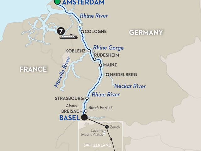 Cruise: deluxe 7-night cruise in an outside stateroom with Avalon’s exclusive Comfort Collection BedsSMDay 1 Amsterdam (Embarkation): welcome reception; Illumination Cruise during Lights FestivalDay 2 Amsterdam: canal cruise Day 3 Cologne: choice of guided city walk or Jewish Heritage walk, Christmas MarketDay 4 Koblenz–Rhine Gorge–Rüdesheim: guided sightseeing in Koblenz; cruise through the Rhine Gorge; visit Siegfried’s Mechanical Musical Instrument Museum in Rüdesheim; special treatDay 5 Mainz. Excursion to Heidelberg: guided walk, visit the Gutenberg Museum in Mainz; excursion to Heidelberg; guided visit of the castle, see the Great VatDay 6 Strasbourg: guided sightseeing, visit the La Petite France district and the gothic cathedral; onboard woodcarving demonstration, Christmas MarketDay 7 Breisach. Excursion to the Black Forest: visit a local woodcarver’s workshop; Christmas marketZürich & Lake Como: 4 nights hotel accommodation with buffet breakfast (B); Monograms Local Host service & Destination Guides with city maps; guided sightseeing, inside visits & special features are shown in UPPERCASE; high-speed train (first-class) Zürich-Como; transfers to/from train stations; round-trip boat ride Como–Bellagio.