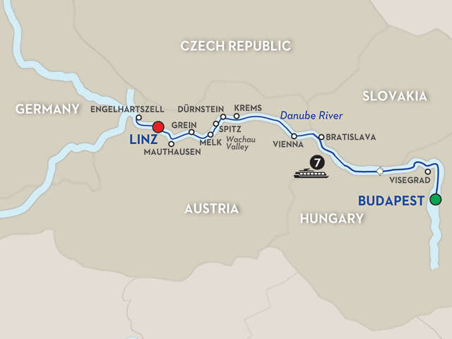 Cruise: deluxe 7-night cruise in an outside stateroom with Avalon’s exclusive Comfort Collection BedsSMDay 1 Budapest (Embarkation)–Scenic Cruising Around Danube Bend–Visegrad: choice of walking tour with language lesson, guided bike tour, or city sightseeing tour; onboard welcome reception; scenic cruising around the Danube BendDay 2 Visegrad: in Visegrad, choice of medieval knights tournament or guided hiking in Danube-Ipoly National ParkDays 3 & 4 Vienna: choice of bike tour, jogging tour, encounter with area business people, or city sightseeing tour with visit of Belvedere Palace to see Klimt’s Kiss; choice of early riser walking tour with breakfast at a Viennese café and entrance to Habsburg private art collection at the Museum of Fine Arts; Habsburg collection entrance with time in the Italian & Dutch Masters Gallery; or Habsburg collection entrance with Military Museum visitDay 5 Krems–Wachau Valley & Strudengau Scenic Cruising–Grein: choice of canoe tour down the Danube; bike tour from Spitz to Krems with sightseeing in Dürnstein and chance to sample local specialties; Wine World Experience with tasting; or local encounter showcasing regional products with included snack and beverage; scenic cruising through Wachau Valley, Strudengau, and past Melk Abbey; castle visit in Grein Day 6 Grein–Mauthausen–Linz: guided walk in Grein, visit the historical theater; in Mauthausen, choice of visit to St. Florian Monastery, guided tour of Mauthausen Concentration Camp, or guided bike tour; onboard tasting of local specialtiesDay 7 Engelhartszell–Schlögen Oxbow Scenic Cruising–Linz: choice of visit to Engelszell Abbey to tour its brewery, enjoy a tasting, and explore its sensory garden, or guided hiking tour to retrace the WWII smugglers route; choice of scenic cruising around the Schlögen Oxbow or guided hike on the Danube Trail; onboard gala farewell dinnerDay 8 Linz (Disembarkation): your vacation ends this morning