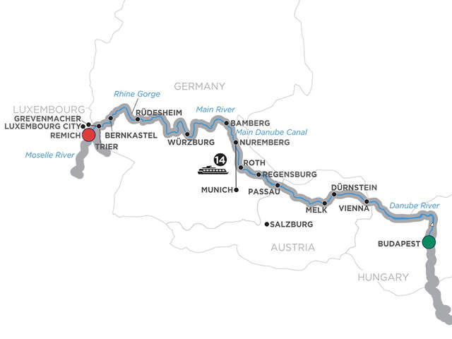 On this Europe river cruise vacation, you’ll sail along the Danube, Main, Rhine, and Moselle Rivers. Board your ship in vibrant Budapest, Hungary, then see some of the most intriguing cities of Austria and Germany, before ending your cruise in Luxembourg. On the first portion of your cruise, from Budapest to Nuremberg, also discover the European Jewish Heritage through dedicated sightseeing in Vienna and Regensburg, and an onboard lecture about Jewish culture and history.Sail out of Budapest, past the impressive Parliament Building on the Danube River, to Austria’s elegant capital of Vienna. There’s a guided walk in the quaint village of Dürnstein, in the heart of the Wachau Valley, and a visit to the magnificent Benedictine Abbey of Melk. You’ll be introduced to the treasures of Passau, Regensburg, and Nuremberg, and take an excursion to Bavaria’s capital, Munich. On the banks of the Main River, you’ll find small towns tucked away behind defensive walls and towered gates. These picturesque Bavarian villages are a photographer’s dream. Visit Würzburg and the impressive Bishop’s Residenz, then sail into the Rhine River and stop in Rüdesheim—a quintessential Rhine Valley town. Later, cruise the wide, peaceful curves of the Moselle River Valley, famous for its picturesque scenery, and arrive in the wine village of Bernkastel surrounded by Germany’s largest expanse of vineyards. Before you leave, we’ll introduce you to some of the famed Moselle wines. In Trier, Germany, believed to be even older than Rome—having been populated over a thousand years before the Romans arrived—a Local Guide will show you the sights, including the Porta Nigra, the only surviving fortified gate from the original Roman settlement. Disembark in Luxembourg and take home many happy memories of this fascinating European river cruise!