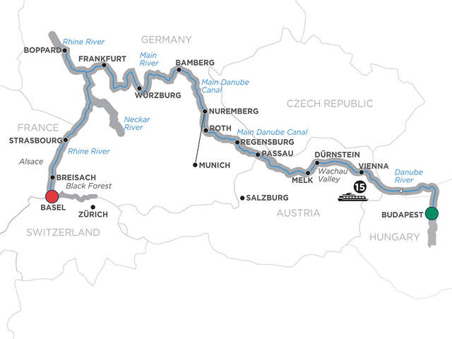 Day 1 Budapest (Embarkation): onboard welcome receptionDay 2 Budapest—Vienna: cruising, or full day golf excursionDay 3 Vienna: guided sightseeing Day 4 Dürnstein—Wachau Valley—Melk: choice of guided tour, or hike up to the castle ruins in Dürnstein; scenic cruise through the Wachau Valley; guided tour of the Benedictine Abbey in Melk; wine tasting on boardDay 5 Passau: guided walkDay 6 Regensburg: guided walk; beer tasting on board, or full day golf excursionDay 7 Nuremberg: choice of guided sightseeing, or Nuremberg Rally Grounds tour, or Roth sightseeingDay 8 Nuremberg—Munich excursion: full day guided tour in Munich Day 9 Bamberg: guided tour, see the Old Town Hall Day 10 Würzburg: guided tour, visit to the Bishop’s Residenz Day 11 Main River Village: guided tourDay 12 Frankfurt. Excursion to Seligenstadt: choice of guided tour in Frankfurt, or guided tour in SeligenstadtDay 13 Boppard—Rhine Gorge—Rüdesheim: time at leisure in Boppard; scenic cruise through the Rhine Gorge; visit to Siegfried’s Mechanical Musical Instrument Museum in Rüdesheim; special treat Day 14 Strasbourg: guided tour, visit to La Petite France district and the gothic cathedralDay 15 Breisach. Excursion to Black Forest: choice of excursion to Black Forest, or guided tour in ColmarDay 16 Basel (Disembarkation): your vacation ends this morning