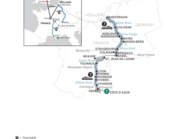 Day 1 Côte d’Azur: welcome to FranceDay 2 Côte d’Azur–Transfer to Arles (Embarkation): onboard welcome reception; cruise into the Camargue region (daylight permitting)Day 3 Arles: guided sightseeing, visit the Roman AmphitheatreDay 4 Avignon: guided sightseeing, visit the Palace of the Popes Day 5 Cruising–Viviers: guided walk, visit Old Town and the cathedralDay 6 Tournon/Tain l’Hermitage–Vienne: guided walk in Tournon; guided walk in VienneDay 7 Lyon: guided sightseeing, picture stop on Fourvière Hill Day 8 Cruising St. Jean de Losne: day at leisure; cheese tasting on boardDay 9 St. Jean de Losne (Disembarkation)–Beaune–Basel, Switzerland (Embarkation): visit the Hôtel-Dieu in Beaune; transfer to Basel; onboard welcome receptionDay 10 Breisach. Excursion to Black Forest: choice of excursion to Black Forest, or guided tour in ColmarDay 11 Strasbourg: guided sightseeing, visit La Petite France district and the gothic cathedralDay 12 Mainz. Excursion to Heidelberg: guided tour of Heidelberg Castle, see the Great Vat; visit the Gutenberg Museum in MainzDay 13 Rüdesheim–Rhine Gorge–Koblenz: visit Siegfried’s Mechanical Musical Instrument Museum in Rüdesheim; special treat; cruise through the Rhine Gorge; guided walk in KoblenzDay 14 Cologne: choice of Cologne highlights walking tour, or Jewish Heritage walking tourDay 15 Amsterdam: canal cruiseDay 16 Amsterdam (Disembarkation) –Paris, France: travel to Paris by high-speed trainDay 17 Paris: guided sightseeingDay 18 Paris–London, England: travel to London by high-speed trainDay 19 London: guided sightseeingDay 20 London: your vacation ends with morning