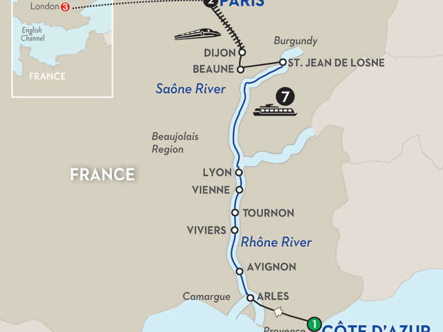Cruise: deluxe 7-night cruise in an outside stateroom with Avalon’s exclusive Comfort Collection BedsSMDay 1 Côte d’Azur: welcome to FranceDay 2 Côte d’Azur–Transfer to Arles (Embarkation): onboard welcome reception; sail into the Camargue region (daylight permitting)Day 3 Arles: guided sightseeing, visit the Roman Amphitheater; evening jazz band entertainmentDay 4 Avignon: guided sightseeing, visit Palace of the PopesDay 5 Cruising–Viviers: guided walk, visit the Old Town and the cathedralDay 6 Tournon/Tain l’Hermitage–Vienne: guided walk in Tournon; onboard jazz music entertainment; guided walk in Vienne; free time to visit the Vienne Jazz FestivalDay 7 Lyon: guided sightseeing; picture stop on Fourvière HillDay 8 Cruising-St. Jean de Losne: day at leisure; cheese tasting; onboard jazz performanceDay 9 St. Jean de Losne (Disembarkation)–Beaune–Dijon–Paris: visit the Hôtel-Dieu in Beaune; TGV train from Dijon to Paris: Day 10 Paris: choice of guided sightseeing or “Heart of Paris” walk, visit Notre Dame CathedralLondon: 3 nights hotel accommodation with buffet breakfast (B); Monograms Local Host Service & Destination Guide with city map; guided sightseeing, inside visits and special features are shown in UPPERCASE; high-speed Eurostar train from Paris to London (standard class*) with porterage for one suitcase; transfers to/from train stations.