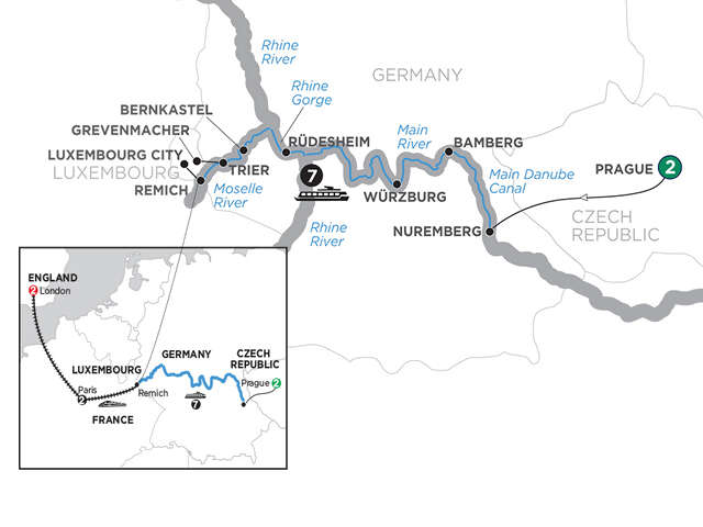 Day 1 Prague: welcome to Czech RepublicDay 2 Prague: guided sightseeing, see the Astronomical Clock and visit Hradčany Castle groundsDay 3 Prague–Nuremberg (Embarkation): travel by motorcoach to Nuremberg, guided tour; onboard welcome receptionDay 4 Bamberg: guided sightseeing, see the Old Town HallDay 5 Würzburg: guided sightseeing, visit the Bishop’s ResidenzDay 6 Main River Village: guided walkDay 7 Rüdesheim–Rhine Gorge: visit Siegfried’s Mechanical Musical Instrument Museum in Rüdesheim; special treat; cruise through the Rhine GorgeDay 8 Bernkastel: guided walk; wine tastingDay 9 Trier: choice of guided city sightseeing or “Roman Trier” sightseeing in Trier, see the Porta NigraDay 10 Remich (Disembarkation)–Paris: transfer by high-speed train to ParisDay 11 Paris: guided sightseeingDay 12 Paris-London, England: travel to London by high-speed trainDay 13 London: guided sightseeingDay 14 London: your vacation ends this morning