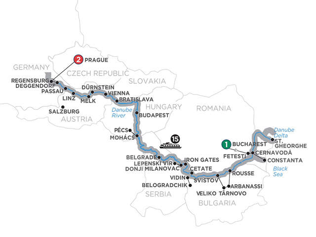 Day 1 Bucharest: welcome to BucharestDay 2 Bucharest–Fetesti (Embarkation): guided sightseeing in Bucharest; onboard welcome receptionDay 3 St. Gheorghe: excursion to Danube Delta: km 0 celebration Day 4 Cernavodă. Excursion to Constanta: guided sightseeing, visit the National History and Archaeological Museum in ConstantaDay 5 Rousse. Excursion to Veliko Târnovo & Arbanassi: guided sightseeing, visit Tsarevet’s Fortress in Veliko Târnovo, and the Ethnographic Museum and the Church of the Nativityin Arbanassi; or guided sightseeing of RousseDay 6 Vidin–Belogradchik: guided sightseeing to Vidin’s fortress and see the rock formations in BelogradchikDay 7 Iron Gates–Donji Milanovac: cruise through the Iron Gates gorge; visit Lepenski Vir archaeological siteDay 8 Belgrade: guided sightseeing; lecture on boardDay 9 Mohács. Excursion to Pécs: guided tour and organ concert in PécsDay 10 Budapest: day at leisureDay 11 Budapest: guided tour, see Heroes’ SquareDay 12 Bratislava: guided sightseeing, visit St. Martin’s CathedralDay 13 Vienna: guided tour, see the Kuntskammer’s collection; choice of additional sightseeing, or a complimentary museum ticketDay 14 Dürnstein–Wachau Valley–Melk: choice of guided walk, or hike up to the castle ruins in Dürnstein; guided visit of the Benedictine Abbey in Melk; wine tastingDay 15 Linz: guided walkDay 16 Passau: guided walkDay 17 Deggendorf (Disembarkation)–Regensburg–Prague: transfer to Regensburg, guided sightseeing; travel by motorcoach to PragueDay 18 Prague: guided sightseeing, see the Astronomical Clock and visit Hradčany Castle groundsDay 19 Prague: your vacation ends this morning