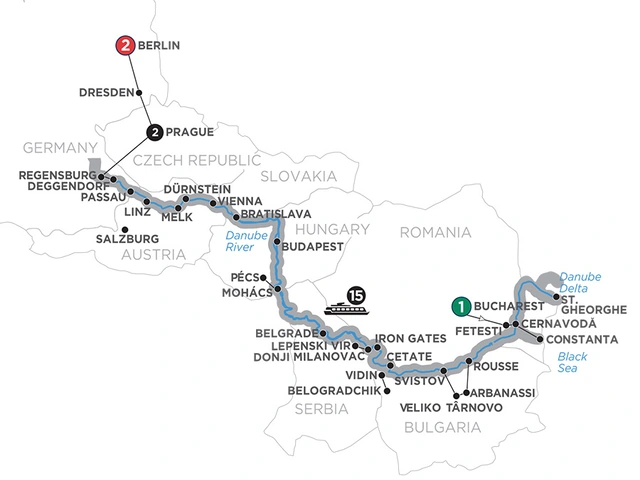 Day 1 Bucharest: welcome to BucharestDay 2 Bucharest—Fetesti (Embarkation): guided sightseeing in Bucharest; onboard welcome receptionDay 3 St. Gheorghe: excursion to Danube Delta: km 0 celebration Day 4 Cernavodă. Excursion to Constanta: guided sightseeing, visit the National History and Archaeological MuseumDay 5 Rousse. Excursion to Veliko Târnovo & Arbanassi: guided sightseeing, visit Tsarevet’s Fortress in Veliko Târnovo, and the Ethnographic Museum and the Church of the Nativityin Arbanassi; or guided sightseeing of RousseDay 6 Vidin—Belogradchik: guided sightseeing to Vidin’s fortress; excursion to Belogradchik, see the rock formations Day 7 Iron Gates—Donji Milanovac: cruise through the Iron Gates gorge; visit Lepenski Vir archaeological siteDay 8 Belgrade: guided sightseeing; lecture on boardDay 9 Mohács. Excursion to Pécs: guided tour and organ concert in PécsDay 10 Budapest: day at leisureDay 11 Budapest: guided tour, see Heroes’ Square; visit Gödöllö Royal PalaceDay 12 Bratislava: guided sightseeing, visit St. Martin’s Cathedral; lecture about royal dinasties in Europe, onboard Waltz lessonDay 13 Vienna: guided tour, see the Kuntskammer’s collection; choice of additional sightseeing, or a complimentary museum ticket; visit Schönbrunn PalaceDay 14 Dürnstein—Wachau Valley—Melk: choice of guided walk, or hike up to the castle ruins in Dürnstein; guided visit of the Benedictine Abbey in Melk or visit Arstetten Castle; wine tastingDay 15 Linz: guided walk or full day excursion Romantic AustriaDay 16 Passau: guided walkDay 17 Deggendorf (Disembarkation)—Regensburg—Prague: transfer to Regensburg, guided sightseeing; travel by motorcoach to PragueDay 18 Prague: guided sightseeing, see the Astronomical Clock and visit Hradčany Castle groundsDay 19 Prague—Dresden—Berlin: transfer to Dresden and city sightseeing; transfer to BerlinDay 20 Berlin: city sightseeingDay 21 Berlin: your vacation ends this morning