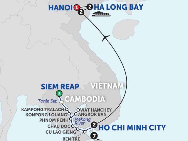 This magical river cruise along the Mekong River will take you through Cambodia and Vietnam, showing you the culture and local traditions of each country and the must-see sites along the way.Your adventure begins in Siem Reap, Cambodia, with the magnificent Temples of Angkor. Constructed between the 9th and 13th centuries, these ancient ruins are a display of architectural complexity and grandeur unlike anything else in the world. Stand in awe at the most famous of these temples, Angkor Wat, which honors the Hindu god, Vishnu; and the Bayon temple, which features some 200 mysterious faces carved in its many towers. Enjoy an inspiring Aspara dance performance and other treasures of the city before embarking on your river cruise. In Kampong Tralach, an ox cart ride will show you the Cambodian countryside and you’ll meet a local farmer and learn about his daily life. The temple of Wat Hanchey, perched on a hilltop, will provide the most stunning views, and then take part in a traditional water blessing with local monks. Continue your journey into Vietnam and stroll through a local market—a unique opportunity to see locals buying and selling fresh produce. Via sampan, visit the home of a local family for a cotton-weaving demonstration and a local workshop which makes rice wine and traditional candies. In bustling Ho Chi Minh City, try your hand in the kitchen with a Vietnamese cooking class and go on an excursion to the Cu Chi Tunnels—the extraordinary network of tunnels used by the Viet Cong during the war.Fly to Hanoi and explore the famous sites, such as the Old Quarter, where peddlers have traded goods for centuries on its 36 ancient streets. Next, a remarkable 2-night cruise along Ha Long Bay will show you its beautiful Limestone Islands. You’ll visit the Cua Van Floating Village, spectacular caves, and even go for a swim at Titop Island. The perfect ending to an unforgettable river cruise vacation!