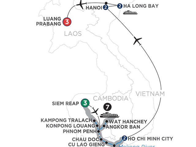Day 1 Siem Reap: Welcome to CambodiaDay 2 Siem Reap: Visit Angkor Wat, Angkor Thom, and Bayon Temple; Apsara dance performanceDay 3 Siem Reap: Visit Ta Prohm, Banteay Srei, and a noodle-making villageDay 4 Siem Reap–Phnom Penh (Embarkation): Fly to Phnom Penh; onboard welcome receptionDay 5 Wat Hanchey–Angkor Ban: Visit Wat Hanchey and partake in a traditional water blessing by local monks; walking tour in Angkor Ban with school visitDay 6 Kampong Tralach–Konpong Louang–Phnom Penh: Ox cart ride through the countryside and visit a local farmer’s home in Kampong Tralach; visit the silversmith village of Konpong Louang; visit the Tuol Sleng Museum and one of the Killing Fields in Phnom PenhDay 7 Phnom Penh: Sightseeing by private cyclo, including the Royal Palace, Silver Pagoda, and the National Museum; show by children from local orphanageDay 8 Border Crossing–Chau Doc: Visit a local market and the religious sites at Sam Mountain in Chau DocDay 9 Long Khanh A–Cu Lao Gieng: Walking tour of Long Khanh A with cotton-weaving demonstration; visit a Catholic church, a local home to see how Vietnamese conical hats are made, and a sampan-making workshop in Cu Lao GiengDay 10 Ben Tre: Visit a local garden and a local workshop to see how rice wine and traditional candy are madeDay 11 Ho Chi Minh City (Disembarkation): Walking tour; visit the famous Rex Hotel for a drink, War Remnants Museum, and Ben Thanh Market; cooking classDay 12 Ho Chi Minh City: Cu Chi Tunnels excursionDay 13 Ho Chi Minh City–Hanoi: Fly to HanoiDay 14 Hanoi: Visit Ho Chi Minh’s mausoleum, One Pillar Pagoda, and Temple of Literature; lunch at Koto; electric cart ride through the Old Quarter; water puppets performanceDay 15 Hanoi–Ha Long Bay (Embarkation): Drive to Ha Long Bay; visit Cua Van floating villageDay 16 Ha Long Bay: Cruise the bay; visit Ti Top Island, Luon Cave, and Dark and Bright Cave; opportunity to explore by kayakDay 17 Ha Long Bay (Disembarkation)–Hanoi–Luang Prabang: Drive to Hanoi; fly to Luang PrabangDay 18 Luang Prabang: Visit Mount Phousi, Wat Mai, the National Museum, and Wat Xieng Thong Day 19 Luang Prabang: Day at leisure Day 20 Luang Prabang: End of vacation