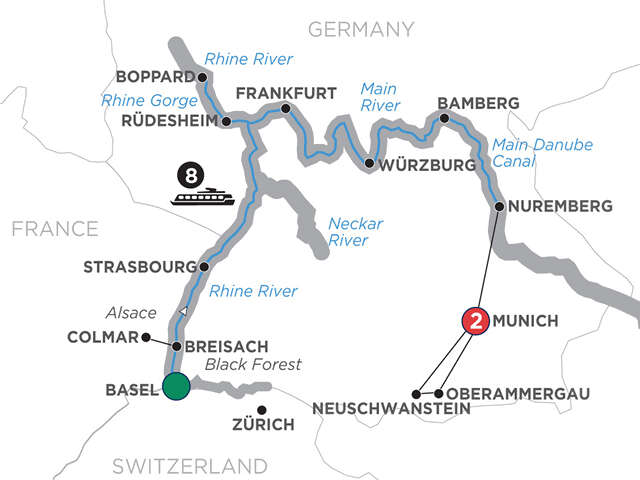 Day 1 Basel (Embarkation): onboard welcome reception Day 2 Breisach. Excursion to Black Forest: choice of excursion to Black Forest, or guided tour in Colmar Day 3 Strasbourg: guided tour, visit to La Petite France district and the gothic cathedral, local beer tasting; onboard beer lectureDay 4 Rüdesheim–Rhine Gorge–Boppard: choice of visit to Siegfried’s Mechanical Musical Instrument Museum, or cable car ride to the Niederwald Monument in Rüdesheim; special treat; scenic cruising through the Rhine Gorge; time at leisure in BoppardDay 5 Frankfurt: onboard beer tasting; choice of guided tour in Frankfurt, or guided tour in SeligenstadtDay 6 Main River Village: guided walking tour, onboard food and beer pairing dinner Day 7 Würzburg: guided tour, visit to the Bishop’s Residenz, taste a local beerDay 8 Bamberg: guided tour, see the Old Town Hall; visit a malt factory or a hop gardenDay 9 Nuremberg (Disembarkation)–Munich: guided tour in Nuremberg; transfer to Munich Day 10 Munich: choice of guided tour of Munich, or full day excursion to Neuschwanstein Castle and the Bavarian village of OberammergauDay 11 Munich: your vacation ends this morning