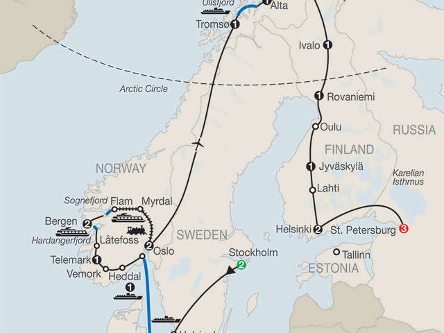 STOCKHOLMWelcome dinner; guided sightseeing, visit City HallHELSINGBORG–ELSINOREFerry crossingCOPENHAGENGuided sightseeing, the Little Mermaid, visit Rosenborg CastleCOPENHAGEN–OSLO HARBOROvernight cruise in first-class, outside, two-berth cabins with private facilities (dinner included)TELEMARKGuided visits of the Heddal stave church and Vemork; admire Låtefoss WaterfallHARDANGERFJORDFerry crossingBERGENSpecial dinner; orientation and funicular ride up to Mount FløyenSOGNEFJORD CRUISEFLAM[LF] Ride the spectacular Flam trainMYRDAL–OSLOBy trainOSLOGuided sightseeing, walk through Frogner Park, visit City HallOSLO–TROMSØBy airTROMSØOrientation, visit the Arctic CathedralULLSFJORD & LYNGENFJORDFerry cruisesALTAVisit the rock carvingsNORTH CAPEVisit the North Cape Visitor CenterKARASJOK[LF] Husky dog experienceROVANIEMIVisit Santa Claus Village; [LF] receive your Arctic Circle Certificate; orientationOULULunch stopLAHTIStop in the international ski resortHELSINKIGuided sightseeing, Sibelius Monument, visit the Lutheran Cathedral and the open-air market; farewell dinnerST. PETERSBURGGuided sightseeing, visit Hermitage Museum and St. Isaac’s Cathedral; Visit Catherine Palace (if closed visit Pavlovsk Palace instead)Headsets throughout the tour