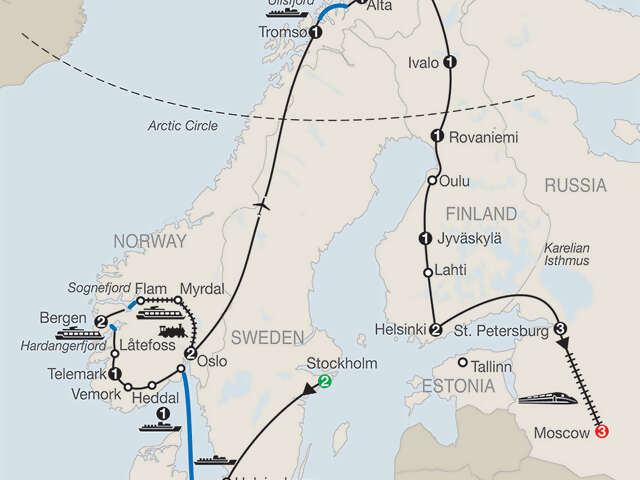 STOCKHOLMWelcome dinner; guided sightseeing, visit City HallHELSINGBORG–ELSINOREFerry crossingCOPENHAGENGuided sightseeing, the Little Mermaid, visit Rosenborg CastleCOPENHAGEN–OSLO HARBOROvernight cruise in first-class, outside, two-berth cabins with private facilities (dinner included)TELEMARKGuided visits of the Heddal stave church and Vemork; admire Låtefoss WaterfallHARDANGERFJORDFerry crossingBERGENSpecial dinner; orientation and funicular ride up to Mount FløyenSOGNEFJORD CRUISEFLAM[LF] Ride the spectacular Flam trainMYRDAL–OSLOBy trainOSLOGuided sightseeing, walk through Frogner Park, visit City HallOSLO–TROMSØBy airTROMSØOrientation, visit the Arctic CathedralULLSFJORD & LYNGENFJORDFerry cruisesALTAVisit the rock carvingsNORTH CAPEVisit the North Cape Visitor CenterKARASJOK[LF] Husky dog experienceROVANIEMIVisit Santa Claus Village; [LF] receive your Arctic Circle Certificate; orientationOULULunch stopLAHTIStop in the international ski resortHELSINKIGuided sightseeing, Sibelius Monument, visit the Lutheran Cathedral and the open-air market; farewell dinnerST. PETERSBURGGuided sightseeing, visit Hermitage Museum and St. Isaac’s Cathedral; Visit Catherine Palace (if closed visit Pavlovsk Palace instead)ST. PETERSBURG-MOSCOWSapsan trainMOSCOWGuided sightseeing Red Square, Kremlin, Armory Museum, see Bolshoi TheaterHeadsets throughout the tour