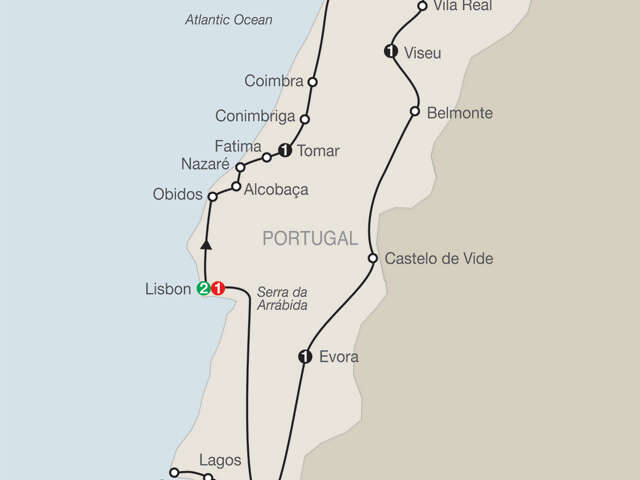 LISBON Welcome dinner; guided sightseeing, visit the Alfama quarter and Jeronimos Monastery; [LF] enjoy a cocktail and a special farewell dinner with wineOBIDOS Walking tour of the medieval townALCOBAÇA Visit the Church of Santa Maria MonasteryNAZARÉ Lunch breakFATIMA Visit the Sanctuary of Our Lady of the RosaryTOMAR Visit the Convent of ChristCONIMBRIGA Visit the Roman ruins and the museumCOIMBRA Visit the University LibraryOPORTO Guided sightseeing, visit the Church of Sao Francisco and the Arabian Hall in the Stock Exchange; [LF] wine tasting at Sandeman & Co.GUIMARAES Walk through the medieval centerVILA REAL Visit the Palacio de MateusVISEU Dinner with wine at a local restaurantBELMONTE Visit the Jewish Museum; [LF] olive oil tastingCASTELO DE VIDE Walk through the Jewish quarterEVORA Guided walking tour, visit the gothic cathedral, the Sao Francisco Church, and the Ossuary ChapelALGARVE Excursion to the Promontory of Sagres, Cape St. Vincent, and LagosHeadsets throughout the tour