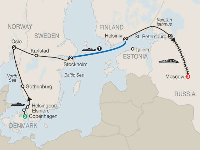 COPENHAGEN Welcome dinner; guided sightseeing, visit the Royal Reception Rooms in Christiansborg Palace; the Little Mermaid; Tivoli Gardens (mid-April to mid-September)ELSINORE Ferry crossing with a view of Hamlet’s castleGOTHENBURG Orientation, [LF] Swedish food experienceOSLO Guided sightseeing, walk through Frogner Park and visit City HallSTOCKHOLM Guided sightseeing, visit City HallSTOCKHOLM–HELSINKI [LF] Overnight cruise in first-class, outside, two-berth cabins with private facilities, including a special Smörgåsbord dinnerHELSINKI Guided sightseeing, visit the Lutheran Cathedral, Sibelius Monument, and the open-air market; farewell dinnerST. PETERSBURGGuided sightseeing, visit Hermitage Museum and St. Isaac’s Cathedral; Visit Catherine Palace (if closed visit Pavlovsk Palace instead)ST. PETERSBURG-MOSCOWSapsan trainMOSCOWGuided sightseeing Red Square, Kremlin, Armory Museum, see Bolshoi TheaterHeadsets throughout the tour