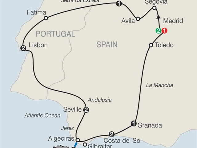 MADRID Welcome and farewell dinners; guided sightseeing, visit the Prado MuseumSEGOVIA Take pictures of the Roman aqueductAVILA Visit the walled townSALAMANCA Orientation walk; [LF] Wine tasting, dinner, and overnight stay at Hacienda ZoritaFATIMA Visit the Sanctuary of Our Lady of the RosaryLISBON Guided sightseeing, visit the Alfama quarter and Jeronimos Monastery; [LF] ride Santa Justa elevator to upper LisbonSEVILLE Guided sightseeing, visit the Alcazar, walk through the Santa Cruz quarterALGECIRAS–TANGIER By ferry across the Strait of GibraltarTANGIER [LF] panoramic drive to Cap Spartel, enjoy mint tea and biscuits; [LF] Moroccon show; guided sightseeing, visit Grand Socco squareGRANADA Guided walking tour, visit the Alhambra complex and the Water Gardens of the Generalife; a special dinner at a local restaurantTOLEDO Guided walking tour, visit an early synagogue, the gothic cathedral, and Santo Tomé Church with one of El Greco’s masterpieces; visit a Damascene steel workshopHeadsets throughout the tour